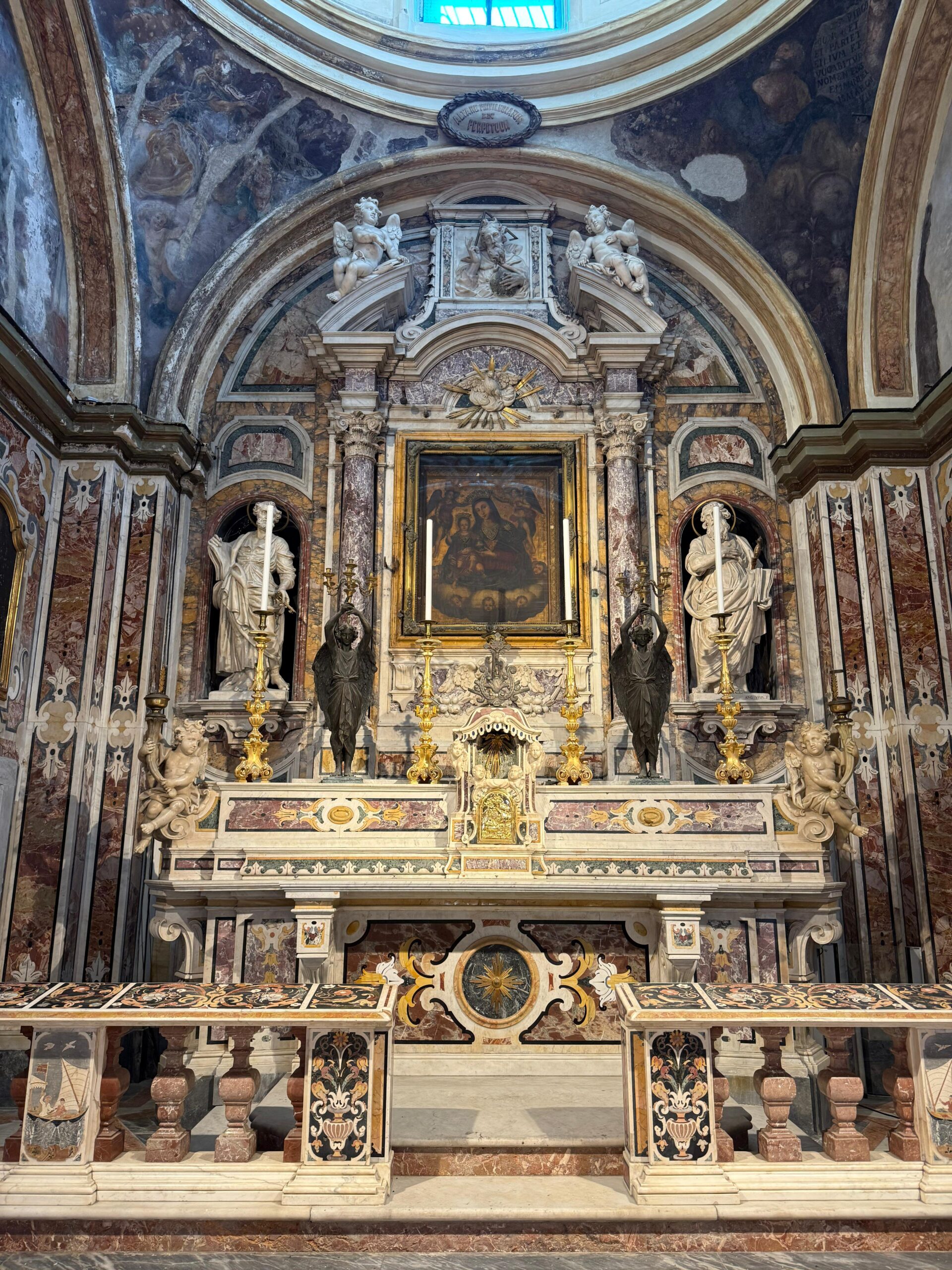 Due lunette laterali raccontano la Nascita e la Dormitio della Vergine, secondo la tradizione bizantina, attribuite a Francesco Palumbo e Nicola Russo. In basso, a sinistra, una copia della Resurrezione di Cristo di Marco Pino da Siena. A destra, la Madonna del Rosario con le anime del Purgatorio, opera di Antonio De Bellis, che vi si autoritrae in basso. Il rosario in corallo richiama il legame profondo con il mare e con i naviganti.