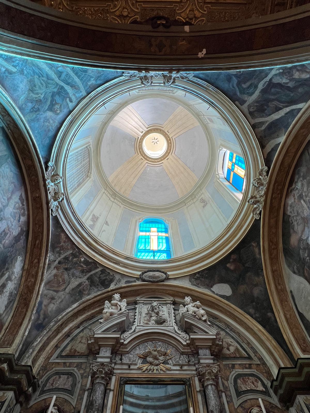 Sotto le lunette compaiono i santi Filippo Neri, Leonardo, Erasmo e Francesco di Sales, fondatori di congregazioni religiose. Nei pennacchi della cupola, quattro profeti sorreggono la volta. La cupola stessa, un tempo affrescata, probabilmente da Nicola Russo, ha purtroppo perso i suoi dipinti a causa dell’umidità. Infine, l’arco prima del tamburo mostra gigli intrecciati che formano le lettere A V M: Ave Vergine Maria.