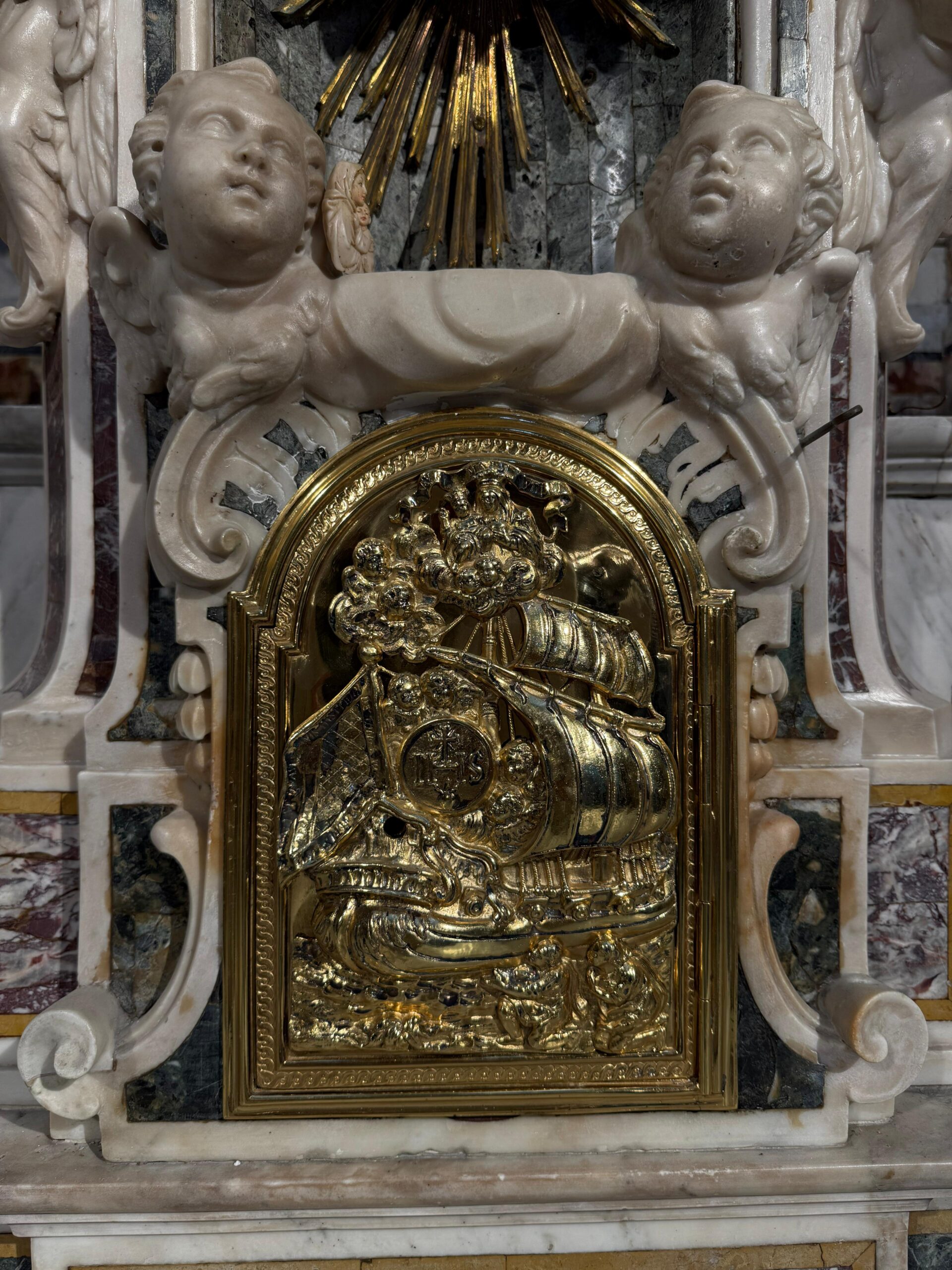 Quello scrigno era il cuore della comunità: serviva a sostenere i confratelli malati, a garantire la dote alle figlie senza maritaggio, a custodire speranza. Durante le esequie, venti torce accompagnavano i pescatori defunti fino al cimitero, rinsaldando il legame tra vivi e morti. Questa tradizione rimase viva fino agli anni 60 del 900. Sotto l’altare e lungo la navata, si trovano cinque botole che custodiscono i confratelli sepolti nella Terra Santa, ancora bagnata dall’acqua del mare: silenziosa dimora di memoria e devozione.